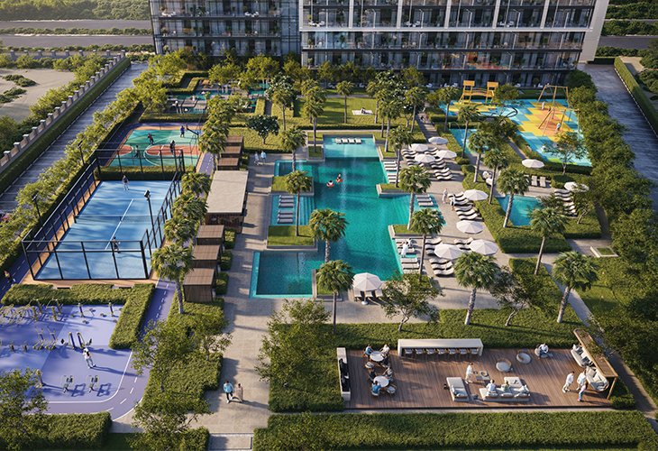 Sierra by Iman Developers is a new architectural gem at Motor City, which is a green, well-developed area known for automotive concepts and low building density. The 42-storey skyscraper is designed in a modern style with cascading terraces and natural textures. The architecture is based on the idea of balance between urbanism, nature and well-being.
