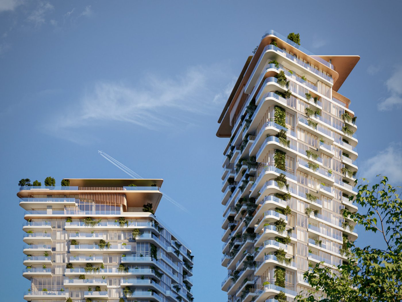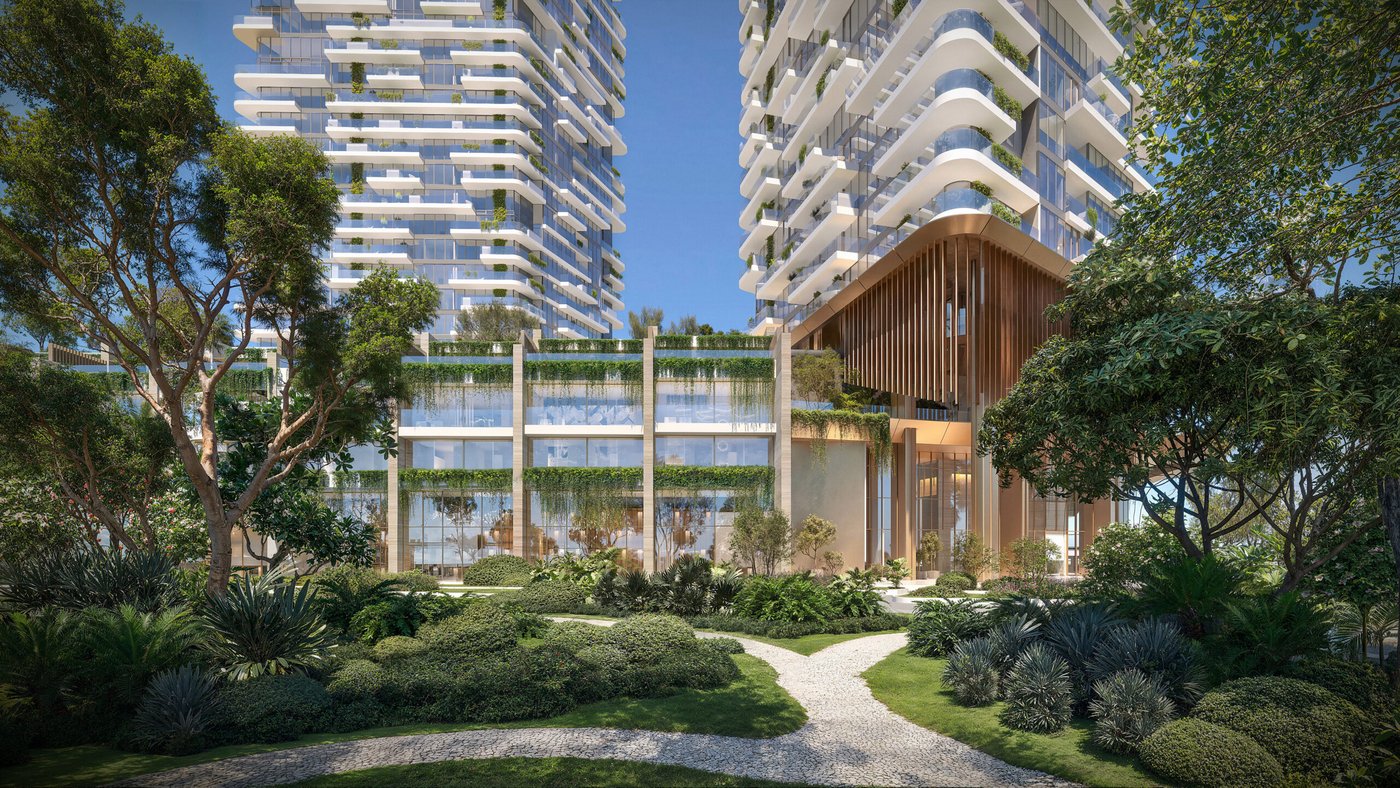 Rising with unparalleled grace, these towers reach up to 180 and 133 metres with 44 and 31 residential floors. The sculptural forms emerge like a sailing ship catching cool wind, where curves, edges, and frames are dynamic and rooted in nature and the coastal beauty. The articulation of balconies, layered terraces, glass facade, and soft, striking white tones creates a balance between open living spaces and the outside’s natural beauty. Situated in the master vision of Cove, the ground level of this property is linked to the pedestrian way that leads to the retail options. The raised podium is curated with communal amenities and sweeping views of the Cove landscapes and the sea.
