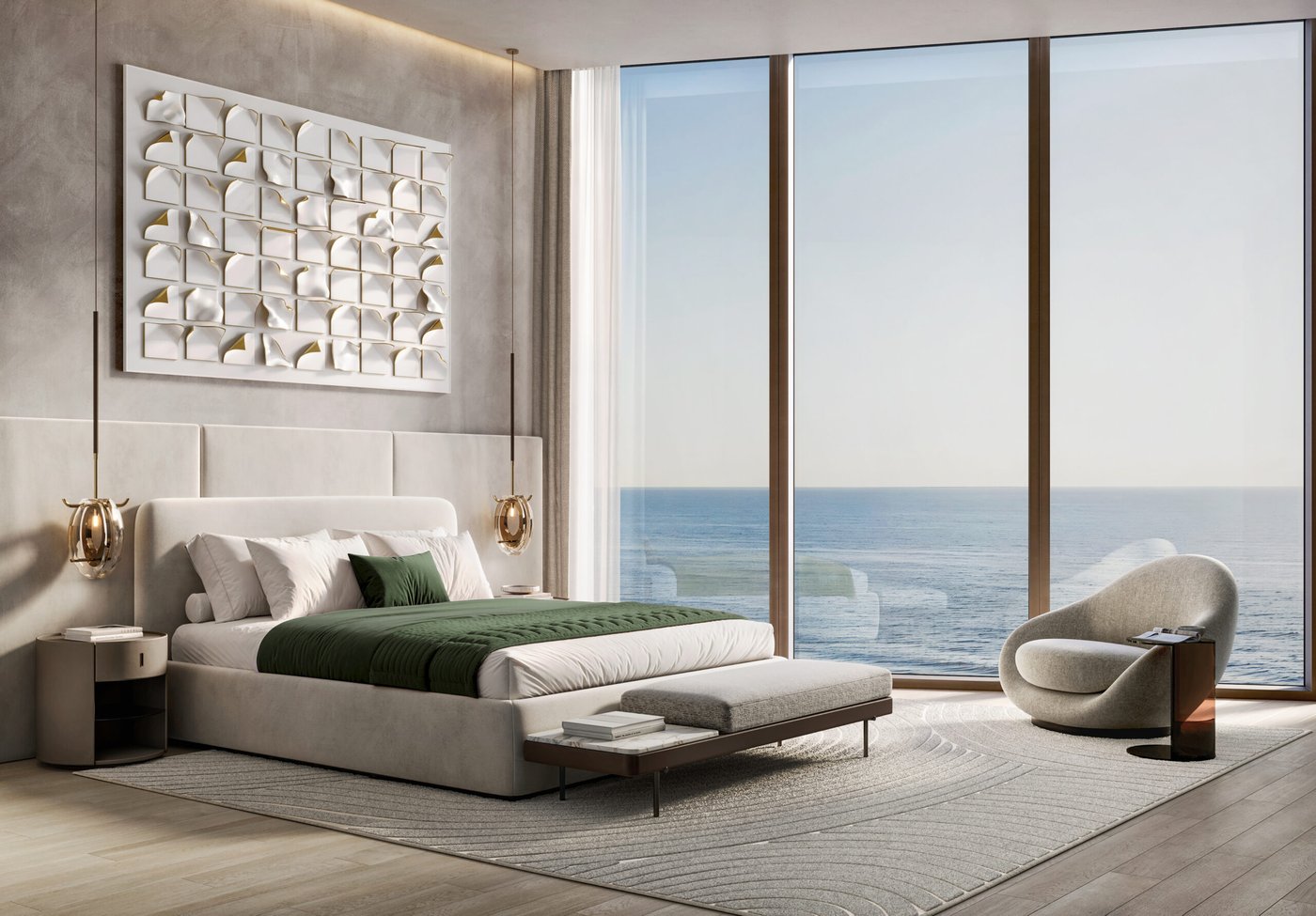 Here, arrival is extraordinary with a drop-off area for each tower, manicured greenery, quick access to the promenade, and the integration of biophilic approaches. A huge lobby for each tower is adorned with smooth finishes, expensive windows, a reception, contemporary design, bespoke lighting, and a sun-lit seating zone, ensuring a sense of serene belonging. There is a total of 513 residences with a diverse range of floor sizes and layouts constructed for families and professionals who value the precious charm of sea-front living.